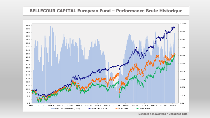 « L’objectif de Bellecour Capital – European Fund est d’assurer une appréciation élevée du capital à moyen et long terme, avec un niveau important de protection à la baisse. Pour atteindre cet objectif, le fonds investit majoritairement dans des sociétés cotées en zone euro mais également aux Etats-Unis, toutes capitalisations confondues, et couvre tout ou partie de son risque par la vente de contrats « futures », ou l’achat de Trackers Short sur indices. Dans le cadre d’une approche résolument « Stock-picking », le fonds investit dans des sociétés présentant : 1/ des modèles économiques de qualité supérieure, 2/ une valorisation attrayante, et 3/ des catalyseurs à court et moyen terme pouvant justifier leur revalorisation (plans de restructuration, résultats meilleurs qu’attendus, acquisitions…). En fonction de la valorisation absolue du portefeuille, de son potentiel d’appréciation et du risque macro-économique perçu, le fonds couvre tout ou partie de son exposition, et ajuste au mieux son niveau de liquidité. »