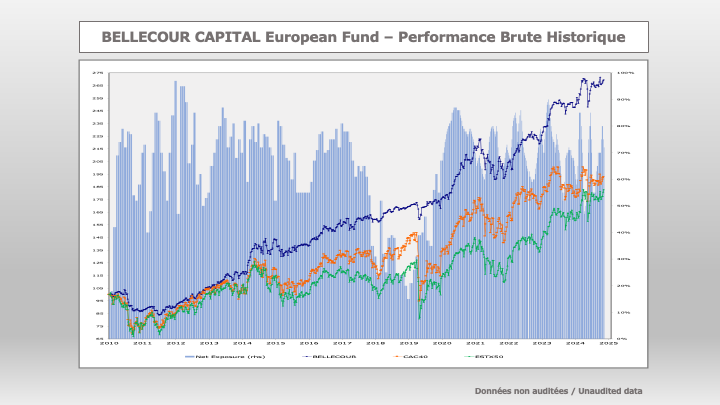 « L’objectif de Bellecour Capital – European Fund est d’assurer une appréciation élevée du capital à moyen et long terme, avec un niveau important de protection à la baisse. Pour atteindre cet objectif, le fonds investit majoritairement dans des sociétés cotées en zone euro mais également aux Etats-Unis, toutes capitalisations confondues, et couvre tout ou partie de son risque par la vente de contrats « futures », ou l’achat de Trackers Short sur indices. Dans le cadre d’une approche résolument « Stock-picking », le fonds investit dans des sociétés présentant : 1/ des modèles économiques de qualité supérieure, 2/ une valorisation attrayante, et 3/ des catalyseurs à court et moyen terme pouvant justifier leur revalorisation (plans de restructuration, résultats meilleurs qu’attendus, acquisitions…). En fonction de la valorisation absolue du portefeuille, de son potentiel d’appréciation et du risque macro-économique perçu, le fonds couvre tout ou partie de son exposition, et ajuste au mieux son niveau de liquidité. »